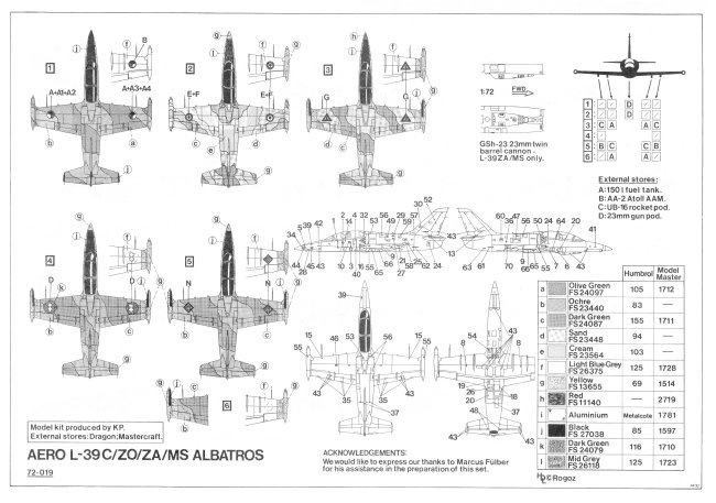 This decal sheet comes in 1/72 scale. The decal sheet includes stencils for one of six L-39 Albatros. This decal sheet covers an Iraqi L-39 during Operation Desert Storm to a German L-39 to a Chech and Slovak "Tiger Meet" L-39 as well as a Egyptian L-39 and an Lithuanian L-39. The painting options include everything from a 3 colour Olive Green and Sand Iraqi Desert Scheme from Desert Storm on this sheet to a Dark Green and Ochre paint scheme of the German L-39. The quality of the sheet is good....excellent colours.....clear printing and completely in register although the stencil data for the 1/72 stencils are too small to be clearly printed and readable. I recommend this sheet to anyone looking for interesting options to the kit decals. Recommended kits are the 1/72 KP kit.