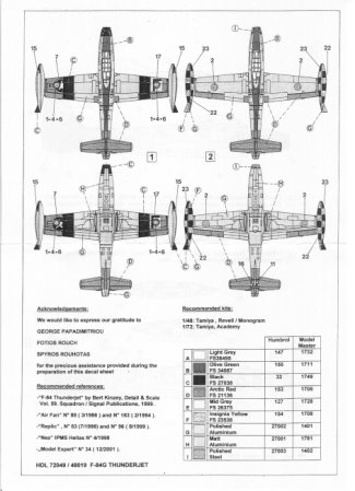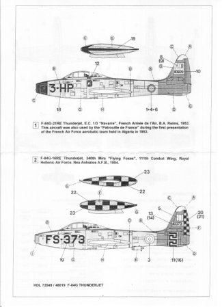 This decal sheet from Hi-Decal Line features 2 different F-84G Thunderjets. One is from the French Armee De l'Air and the second is from the Greek Royal Hellenic Airforce. | |||
